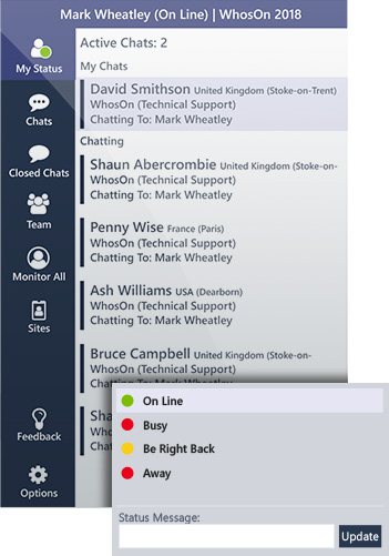 WhosOn makes it easy to help multiple customers at once. Unlike a telephone call, where you can only speak to one person at a time, live chat allows you to balance several concurrent chats.